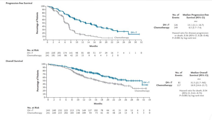 图2.RC48-016研究主要研究终点:联合治疗组较化疗对照组的无进展生存期(上图)与总生存期(下图)均达到显著差异