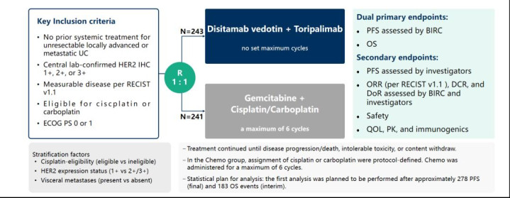 该研究是全球首个针对既往未接受过系统治疗的晚期尿路上皮癌患者采用抗HER2-ADC疗法的随机对照3期临床研究,旨在评估抗HER2-ADC治疗药物维迪西妥单抗与抗PD-1药物特瑞普利单抗联合治疗,相较于传统铂类化疗的疗效与安全性。主要研究终点为无进展生存期(PFS)与总生存期(OS)。